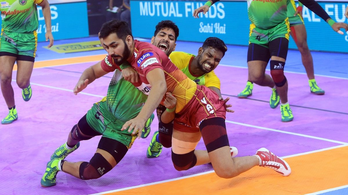 Sachin of Patna Pirates makes desperate efforts at getting his raid point against Telugu Titans in Match 116 of VIVO Pro Kabaddi League Season 8