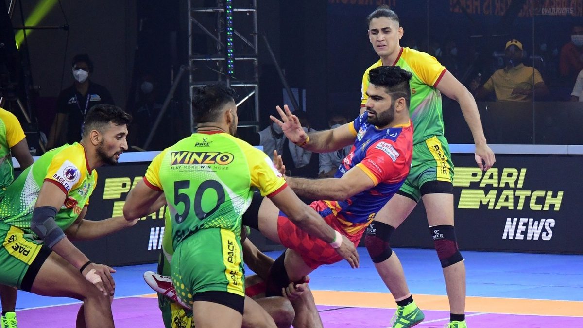 Patna Pirates' Prashant Kumar is tackled by U.P. Yoddha's Sumit in Semi-final 1 of VIVO Pro Kabaddi League Season 8